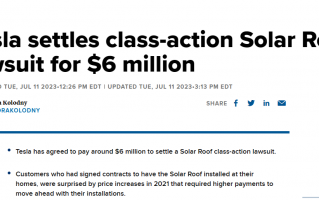 智能家居 特斯拉同意支付 600 万美元,结束太阳能屋顶涨价有关诉讼 特斯拉在 2021 年宣布旗下“太阳能屋顶”涨价,要求签订了合同的用户加钱安装,因此招致了客户集体诉讼。结果目前已经出炉,特斯拉同意支付 600 万美元(约 4325.28 亿元人民币)并以最初向客户... 智能家居 2023-07-13 823 #特斯拉 #集体诉讼 #太阳能屋顶